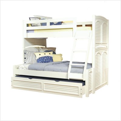 6510-913 Twin Over Full Bunkbed Comfortable attic styling takes on a touch of coastal elements with signature louvers on key pieces. A classic example of combined function and visual appeal in an eggshell white with light flyspecking. Matching wooden knob hardware is a testament to the handcrafted look of the collection. Features: -Twin over full bunkbed. -Cottage Traditions collection. -Distressed Eggshell White finish. -Lower headboard has gracefully arched crown overlay ending with a coped block at each end of top rail. -Upper footboard has large straight cap rail ending in a coped block. -Premium rail and guardrail pack has solid pine, pine veneer and MDF construction. -Full extension has solid pine, pine veneer and MDF construction. -Trundle unit functions as bed or storage and has casters for easy movement. -Additional slats provide extra support and eliminate the need for a bunkie board. -Assembly required. -Manufacturer provides one year warranty from ship date. Read more...